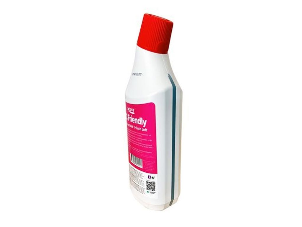 Håll din toalett ren och fräsch med miljömärkt rengöringsmedel. Activa WC Friendly är ett Svanenmärkt rengöringsmedel för användning i toaletten. Anpassad för säker användning på sanitetsporslin. Den effektiva formeln löser snabbt upp kalk och andra beläggningar för att göra rengöringen enkel och effektiv. Applicera en liten mängd vätska i och under kanten i toalettstolen. Låt verka i 5 minuter, skrubba sedan rent och spola. - pH-värde: 2-3 - Lukt: parfymerad - Utseende: blå vätska - Svanen: licensnummer 50260301