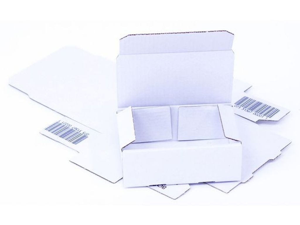 Självlåsande vit wellpapplåda tillverkad i återvinningsbar wellpapp. Lådan viks snabbt ihop till en färdig förpackning och har en stabil konstruktion. Använd tejp för att enkelt försluta lådan. Lådan ger ett bra skydd vid transport eller förvaring och passar utmärkt för utskick. Wellpapp har en hög tålighet i förhållande till sin lätta vikt, vilket gör material perfekt för användning i transportlådor. - Återvinningsbart material - FEFCO standard 0426 - ES2 - Självlåsande - Färg: Vit - Tjocklek: 2 mm - Volymvikt: 71 g - Vikt: 16 g - Innermått: (LxBxH) 97 x 60 x 35 mm