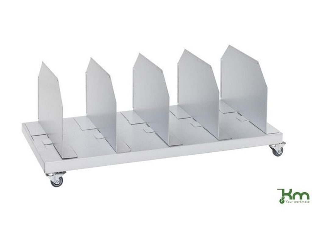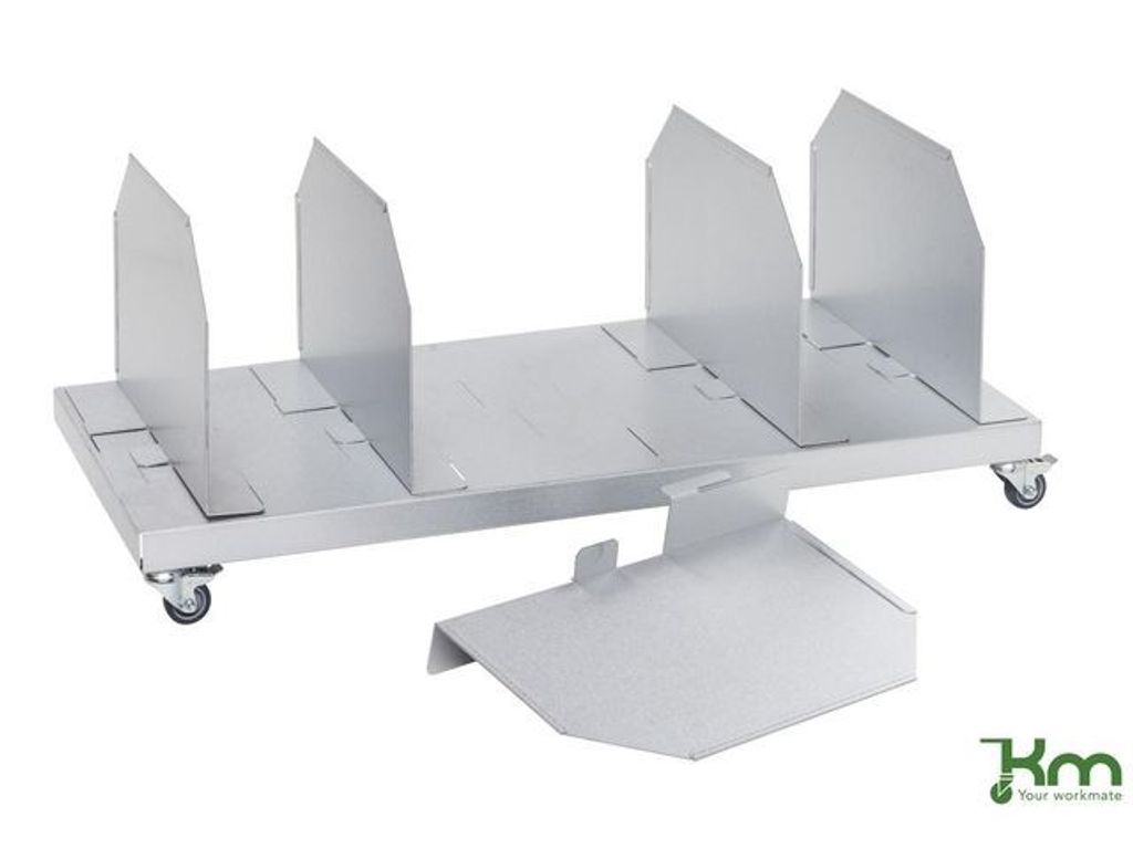 Låg container idealisk för lagring eller förförflyttning av kartong eller skivor. Liten flexibel elzinkad rullvagn med avdelare. - Belastning 60kg - Storlek: 1050 x 500 x 418mm - Färg: Elförzinkad - Vikt: 26kg - Bromsade hjul: Ja - Hjul: 4 länkhjul, 2 med broms 50mm
