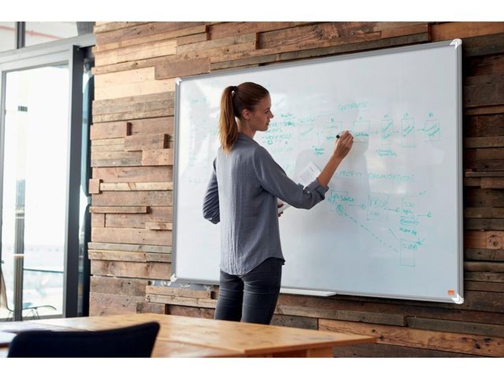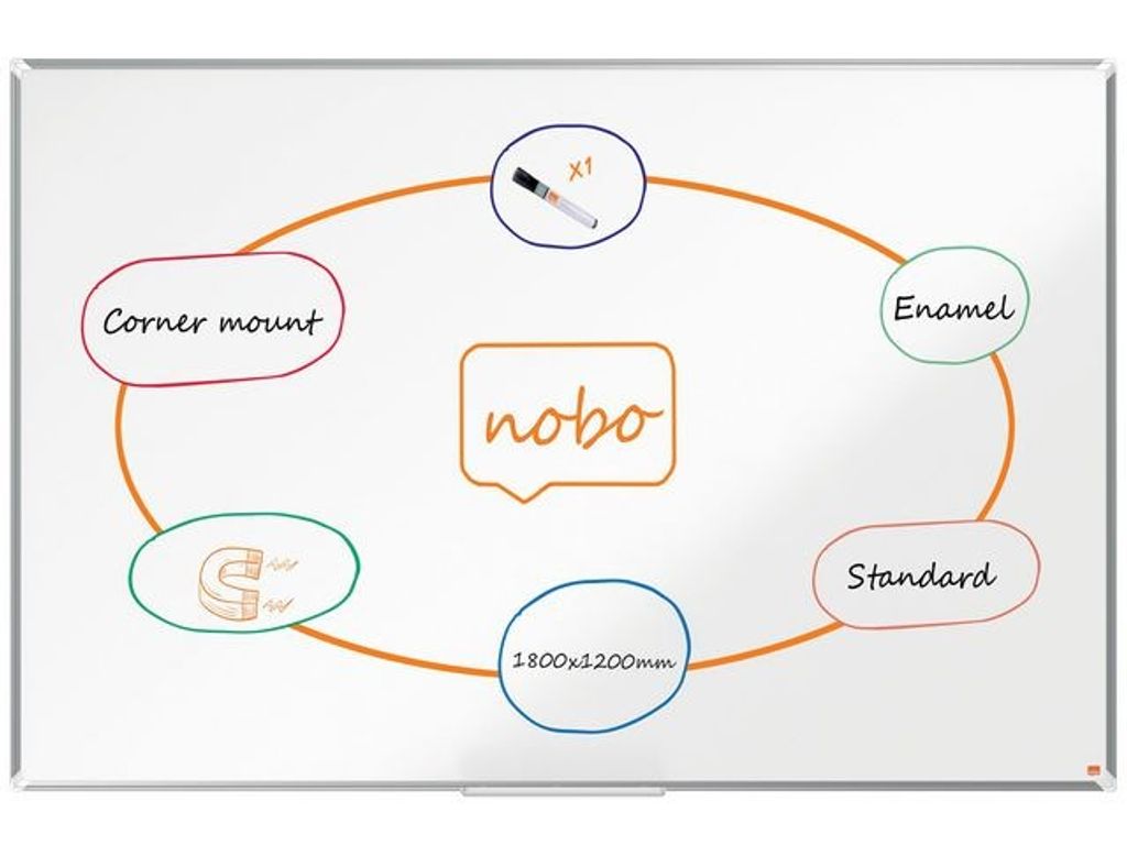 Emaljerad magnetisk whiteboardtavla med en modern elegant ramkant i aluminium. Fästes med genomgående hörnmontering och inkluderar ett stort pennfack för bekväm förvaring av whiteboardpennor och sudd. Emaljerad magnetisk whiteboard yta erbjuder en överlägsen grad av raderbarhet och hållbarhet för frekvent användning. - Storlek: 1800x1200 mm - Modern snygg ramkant i aluminium runtom - Fästes med en traditionell genomgående hörnmontering på väggen - Stort pennfack för bekväm förvaring av whiteboardpennor och sudd - En Nobo whiteboardpenna medföljer - 25 års garanti på ytan