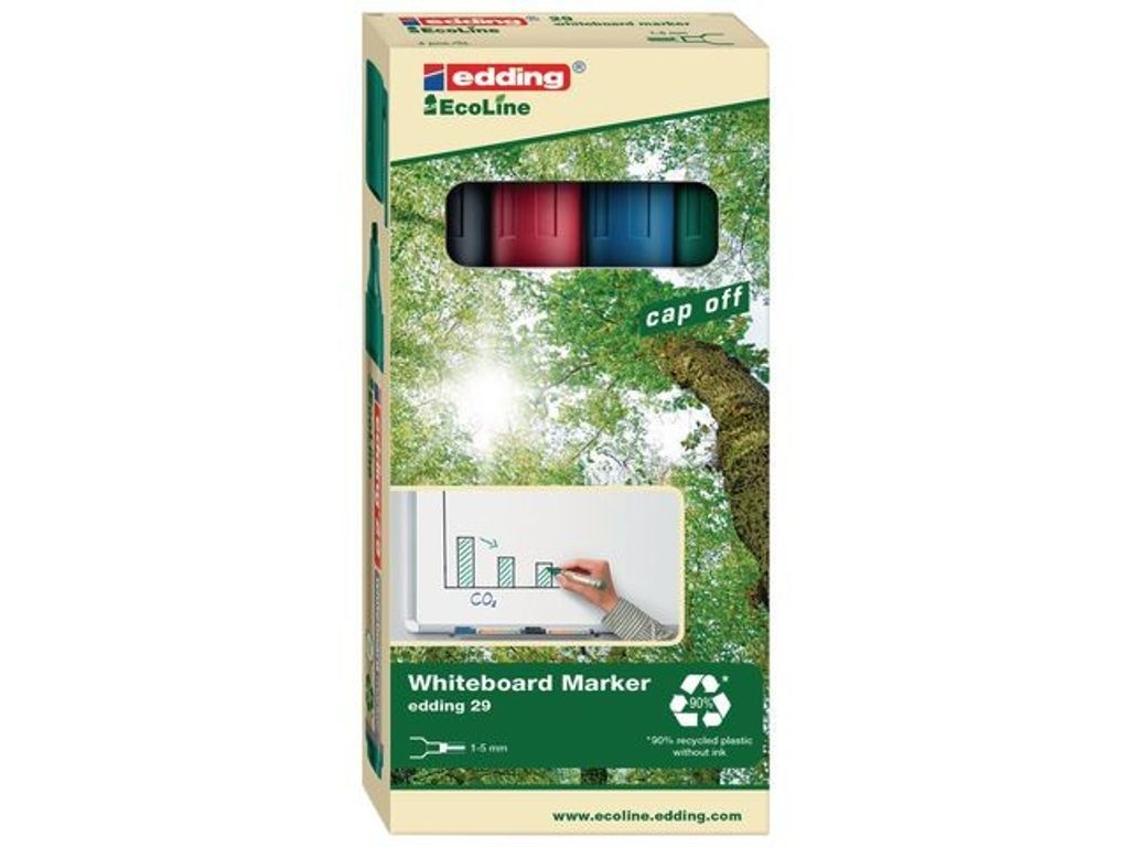 Whiteboardmärkpennan Edding 29 EcoLine fungerar på nästan alla icke-porösa ytor och består av plast som är tillverkad av 90 % återvunnet material. Den här märkpennan är speciellt utformad för användning på whiteboardtavlor och nästan alla icke-porösa ytor, till exempel emalj, glas och melamin. Det snabbtorkande och ljusbeständiga bläcket kan enkelt torkas bort. Märkpennan innehåller ett torksäkert bläck som inte torkar även om korken är av under flera veckor. Whiteboardpennan Edding 29 EcoLine har en snedskuren spets med en linjebredd på 1–5 mm och den passar utmärkt när du vill ha fet och flödande text. Märkpennan har en lätt design, vilket gör den extremt bekväm och enkel att använda. Den levereras med kork och fickklämma, vilket gör den lätt att ta med sig. - Minst 90 % av den totala mängd plast som används är återvunnet material - Icke permanent bläck - Med huv - Snedskuren spets - Linjebredd: 1 - 5 mm - Textfärg: Svart, Blå, Röd och Grön - Färg pennkropp: Beige