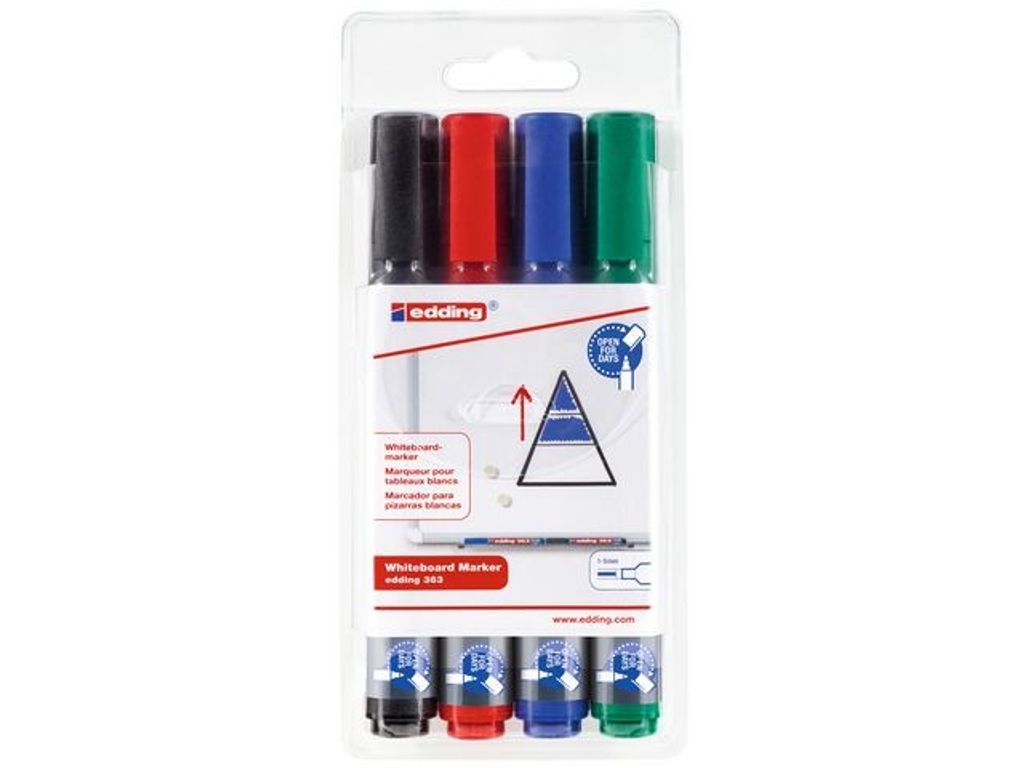 Whiteboardmärkpennan Edding 363 innehåller ett luktfritt pigmentbläck och kan användas på alla whiteboardtavlor och andra icke-porösa ytor. Den här märkpennan är speciellt utformad för användning på whiteboardtavlor och nästan alla icke-porösa ytor, till exempel emalj, glas och melamin. Det snabbtorkande och ljusbeständiga bläcket kan enkelt torkas bort. Märkpennan innehåller ett torksäkert bläck som - Icke permanent bläck - Med huv - Snedskuren spets - Linjebredd: 1 - 5 mm - Textfärg: Svart, Blå, Röd och Grön - Färg pennkropp: Svart/Grå