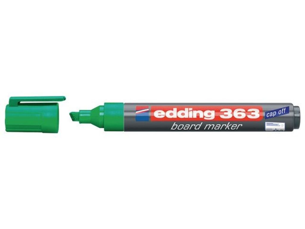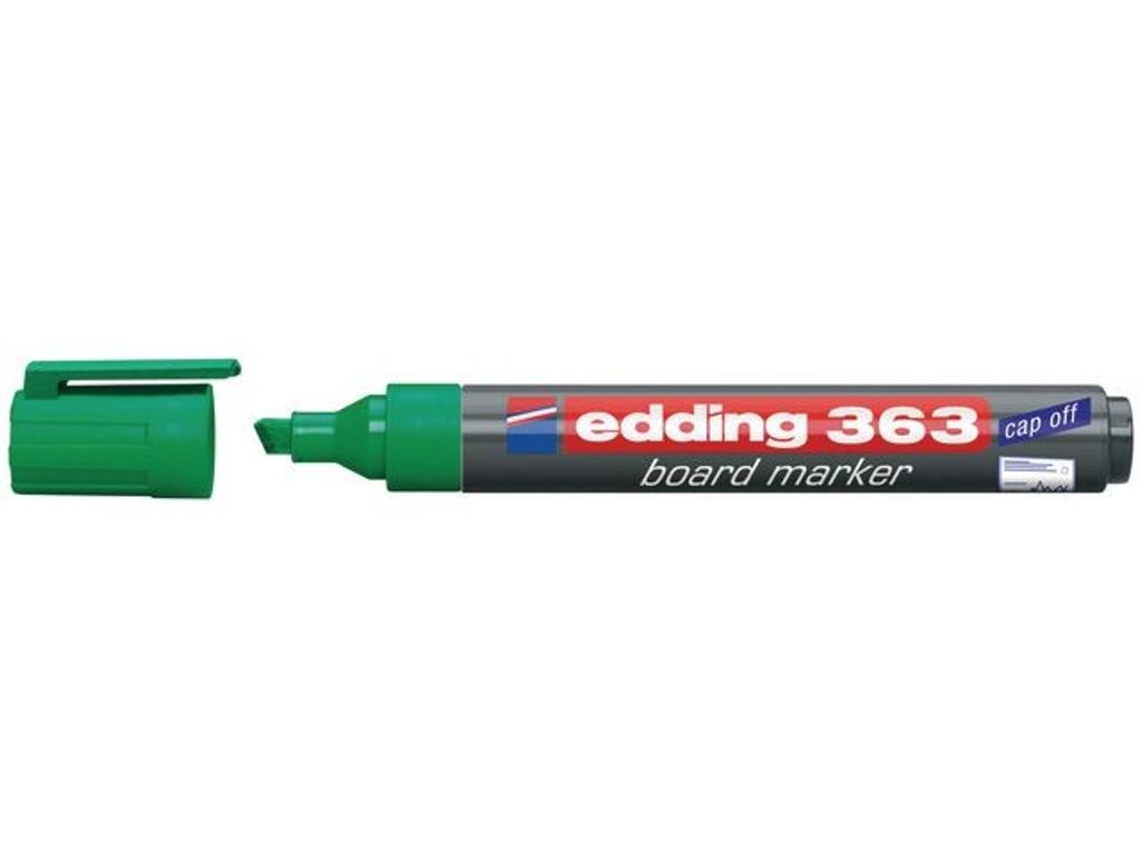 Whiteboardmärkpennan Edding 363 innehåller ett luktfritt pigmentbläck och kan användas på alla whiteboardtavlor och andra icke-porösa ytor. Den här märkpennan är speciellt utformad för användning på whiteboardtavlor och nästan alla icke-porösa ytor, till exempel emalj, glas och melamin. Det snabbtorkande och ljusbeständiga bläcket kan enkelt torkas bort. Märkpennan innehåller ett torksäkert bläck som inte torkar även om korken är av under flera veckor. Whiteboardmärkpennan Edding 363 har en snedskuren spets som ger 1–5 mm linjebredd och den passar utmärkt när du vill ha fet och flödande text. Märkpennan har en lätt design, vilket gör den extremt bekväm och enkel att använda. Den levereras med kork och fickklämma, vilket gör den lätt att ta med sig. - Icke permanent bläck - Med huv - Snedskuren spets - Linjebredd: 1 - 5 mm - Textfärg: Grön - Färg pennkropp: Svart/Grå