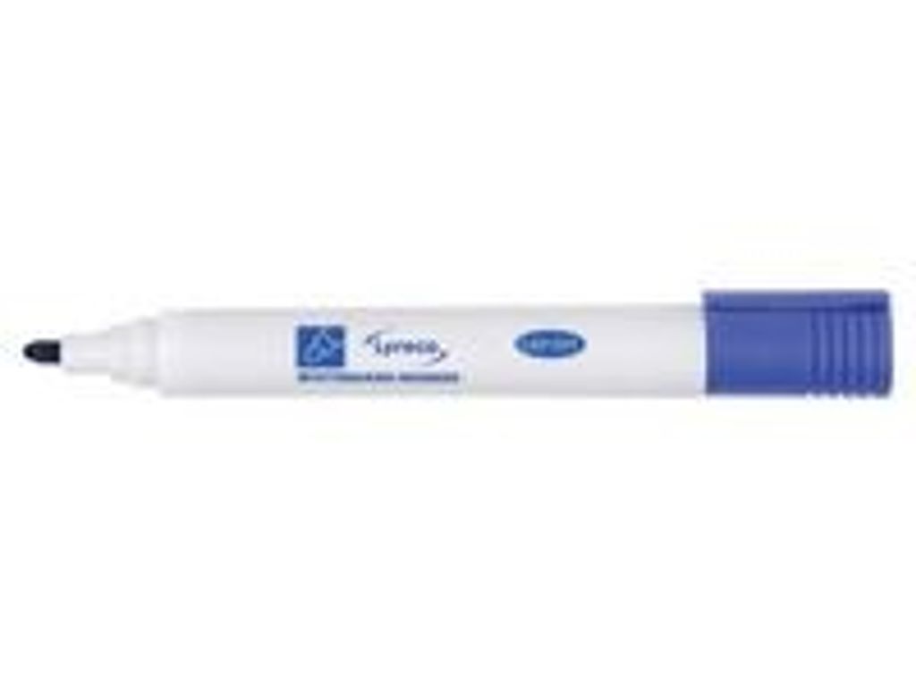 Penna med cap off-bläck, vilket innebär att whiteboardpennan kan ligga en kortare tid utan huv och ändå gå att skriva med. Pennans bläck är fritt från xylen och kan enkelt torkas bort med en torr trasa. Med pennkropp och huv av PP-plast. - Icke permanent bläck - Med huv - Rund spets - Spetsbredd: 1,5-3mm - Textfärg: Blå - Färg pennkropp: Vit