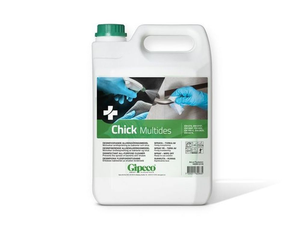 Chick Multides, specialmedel med desinficerande effekt för rengöring och desinficering av ytor där höga krav på hygien ställs. Färdig brukslösning för rengöring av alla ytor som tål vatten. Har både desinficerande och rengörande effekt, sparar därför arbetsmoment. Motverkar smittspridning av bakterier och virus där höga krav på hygien ställs, t.ex. inom all slags livsmedelshantering. Har ett brett desinficerande register och en mycket god rengöringsförmåga. Biociden i Chick Multides är effektiv mot så kallade höljeförsedda virus Bruksanvisning, spraya Chick Multides på ytan. Torka sedan rent med torr duk eller papper, så att ytan blir helt torr. Biociden i Chick Multides har ett brett desinficerande register och tensidsammansättningen bidrar till att biociden kan verka med optimal effekt. Produkten är alkoholfri och därför ej brandklassad. Virusdödande effekt Biociden i Chick Multides är effektiv mot s.k. höljeförsedda virus. Testade mot bakterier och virus enligt EN 1276 och EN 14476. - pH-värde: ca 7 - Lukt: Parfym - Dosering: Används outspädd - Utseende: Röd vätska