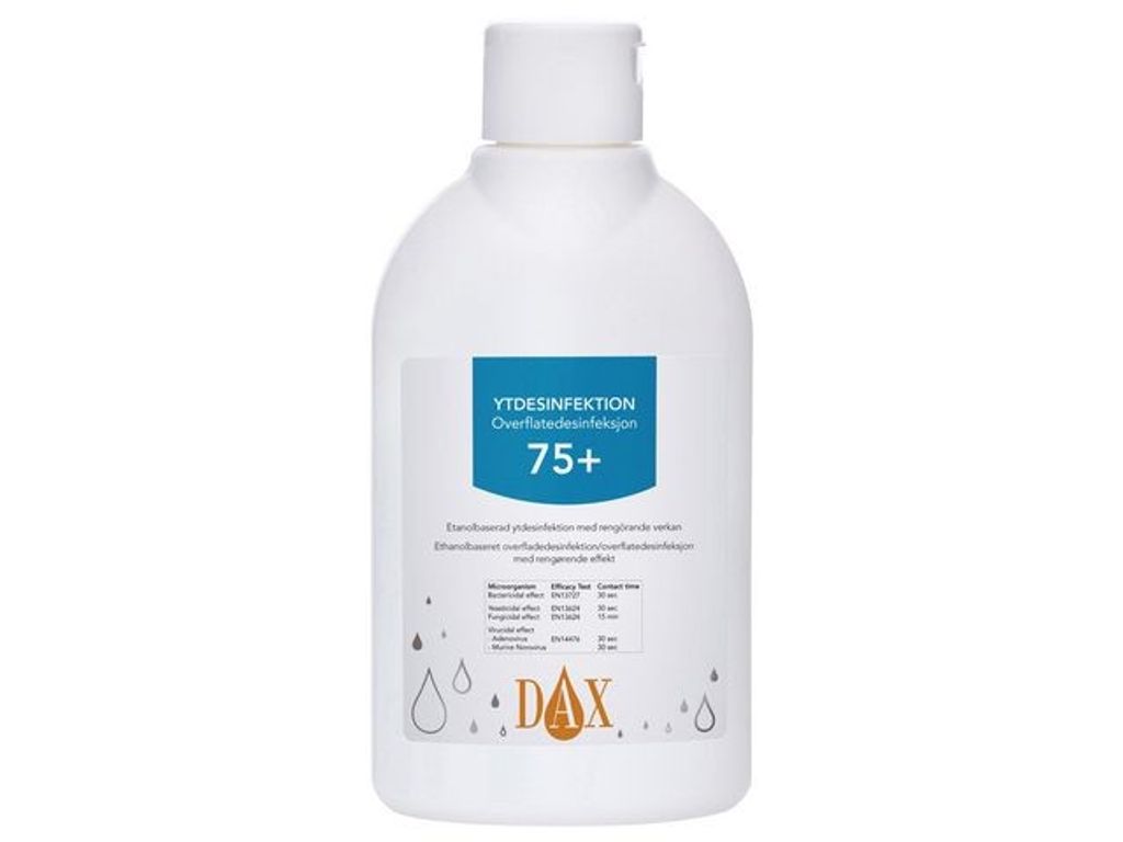 Effektiv och snabb desinfektion av släta ytor, bord, bänkar etc. DAX Ytdesinfektion 75+ är avsedd för desinfektion av släta ytor t.ex. bänkar, bord och undersökningsbritsar. Verkar snabbt och effektivt utan att lämna spår på den behandlade ytan. 75 volymprocent alkoholstyrka, med etanol som huvudkomponent. Innehåller tensid vilket göra att ytan inte behöver förbehandlas. DAX Ytdesinfektion 75+ är effektiv mot bakterier, svampar och olika typer av virus som HIV, Hepatit B och C samt vissa nakna virus som Adenovirus och Murine Norovirus. Testad och godkänd enligt EN 13727, EN 13697, EN 13624, EN 14348, EN 14476. - pH-värde: 6-8 - Dosering: Används outspädd - Utseende: Klar/färglös vätska