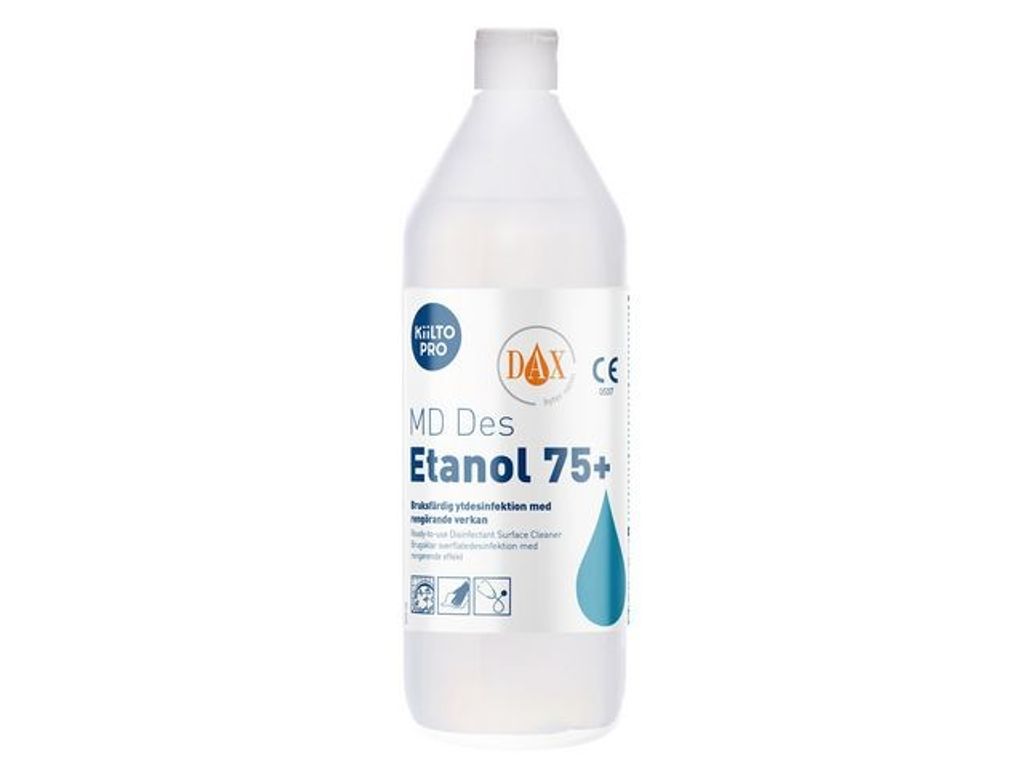 Medicinteknisk produkt, för professionell användning. KiiltoPro MD Des Etanol 75+ är en medicinteknisk produkt som består av ca 75 vol% denaturerad etanol samt tensid (smutslösande) och är lämplig för desinfektion av hårda ytor och non-invasiv medicinteknisk utrustning inom hälso och sjukvården och tandvården. Exempel på användningsområde är undersökningsbritsar, bänkar, bord,patientsängar eller annan non-invasiv medicinteknisk utrustning som tål alkohol. Även klassad som biocid PT2 och kan användas på allmänna ytor. Produkten är effektiv mot bakterier, jästsvamp och höljeförsedda virus, samt vissa nakna virus som Adenovirus, Rotavirus och Murine Norovirus. Verkar snabbt och avdunstar utan att lämna torkränder på den behandlade ytan. Används på ytor som tål alkohol. Om du är osäker på om ytan tål alkohol, prova först på ett undanskymt ställe. Tillsatsen av tensid gör att ytan inte behöver rengöras först om den är lite smutsig. - CE-märkt medicinteknisk produkt, klass IIa, NB 0537 - pH-värde: 6-8 - Utseende: Flytande vätska